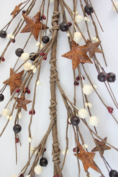 This gorgeous burgundy/cream color berry combined with rusty star garland is 5 feet long. It is perfect for your prim, rustic, country crafting and decor.