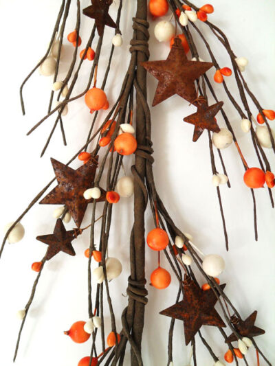 This beautiful orange, cream-colored berry garland with rusty stars is 5 feet long. It is perfect for your primitive, rustic, country crafting and decor.