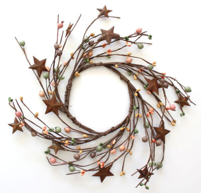 EV-305N 4.5" Beautiful Mustard Primitive Pip Berry Candle Rings with Rusty Stars $5.25EV-415N 4.5″ Primitive Berries Candle Ring with Rusty Stars in Peach, Mustard & Green Color